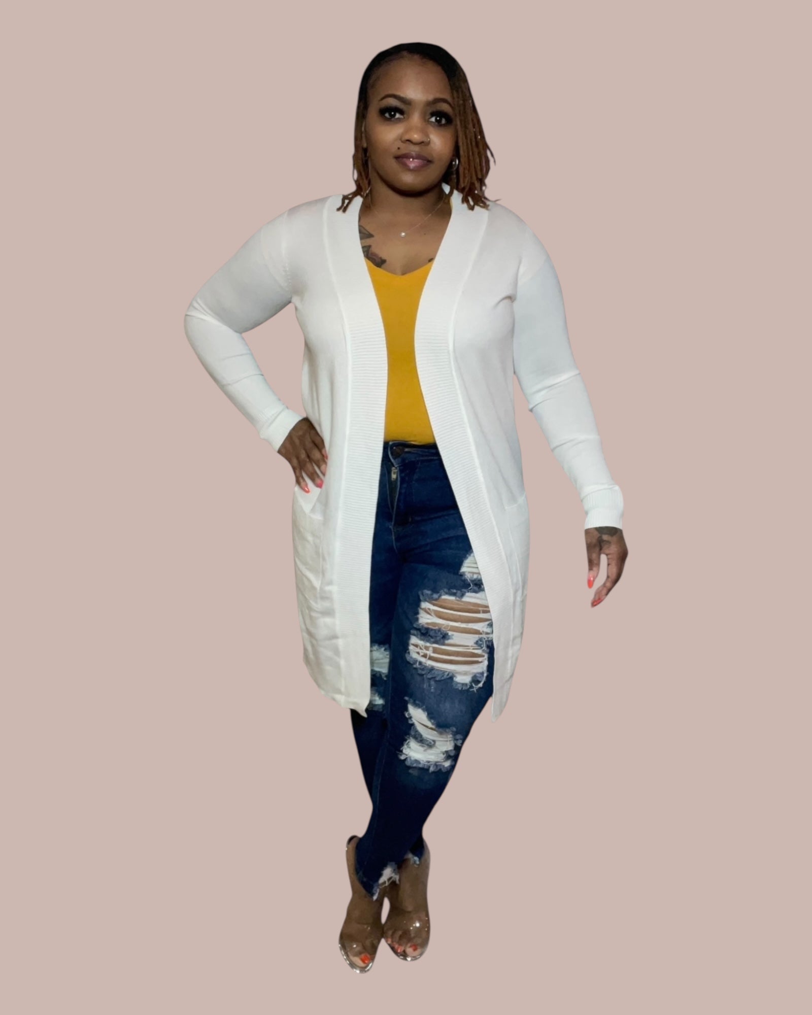 Our "Open Front Cardigan" in Ivory is the perfect combination of comfort and style. Made with a breathable and stretchy fabric, it will keep you comfortable all day long. The stunning Ivory color adds a pop of color to any outfit. Expertly designed to provide both fashion and function.