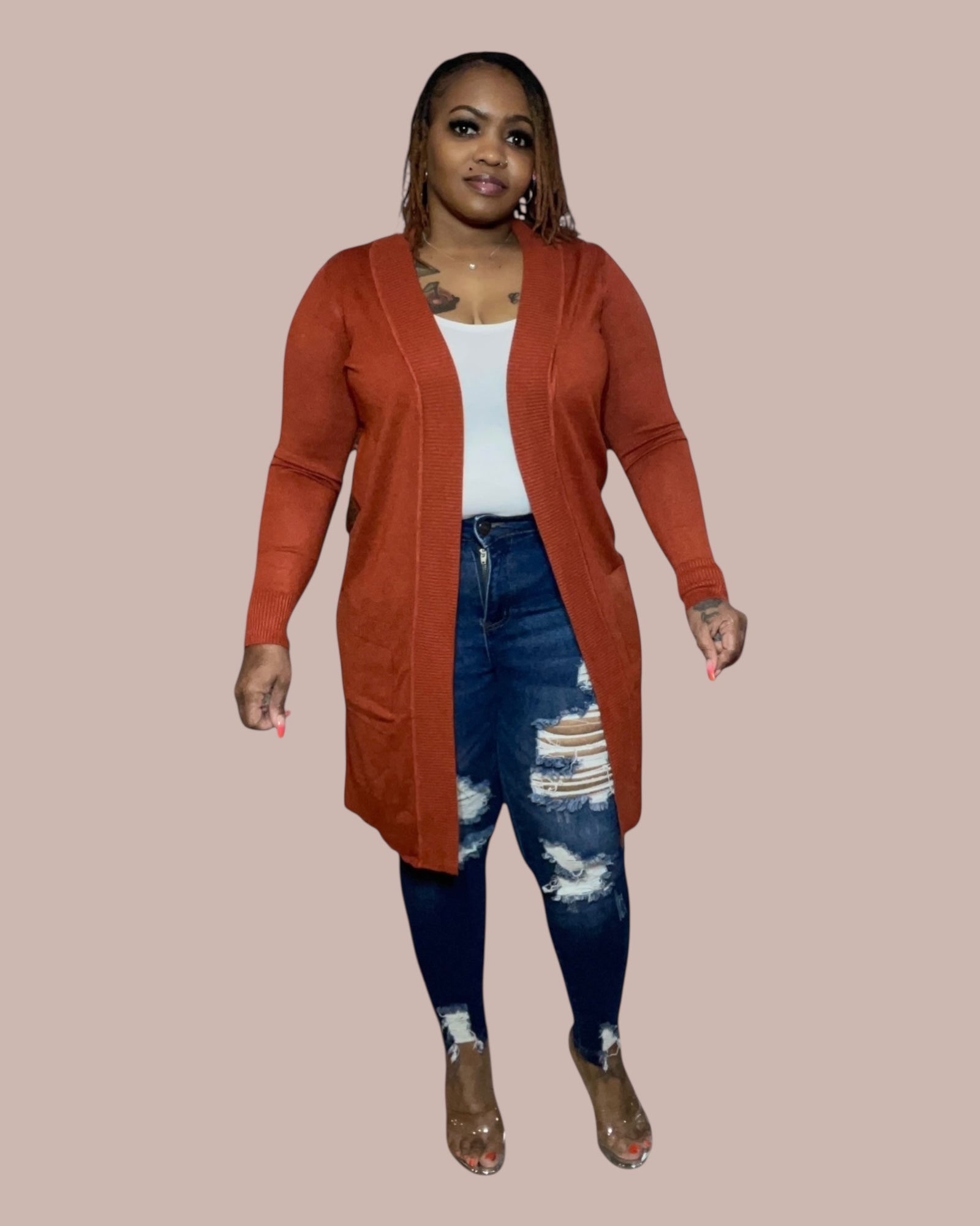 This rust-colored open front cardigan is crafted from comfortable, breathable fabric with a hint of stretch for a superior fit. Its versatile design allows it to pair easily with any outfit, making it the perfect layering piece for any occasion.
